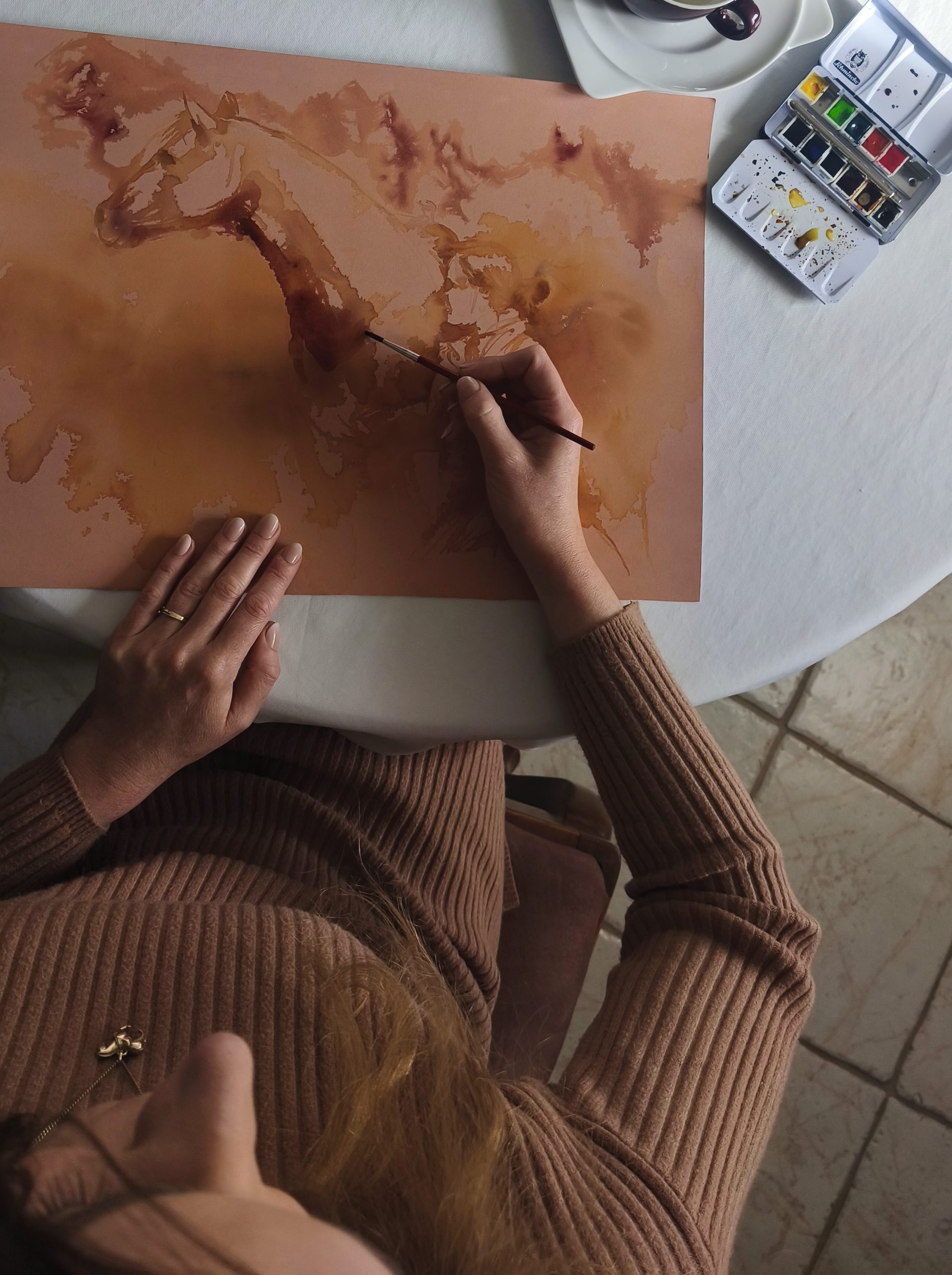Um echte Emotionen in Farbe auf das Papier zu übertragen, habe ich eine kombinierte Technik gewählt. Die Basis bildet eine Untermalung in Aquarell: fließend, lebendig und voller schöner Zufälligkeiten: Genau wie ein flüchtiger Moment mit einem Herzenspferd.
